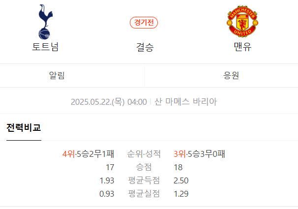 2025년 5월 22일 오전 4시, 스페인 빌바오 산 마메스에서 토트넘과 맨유가 격돌합니다.